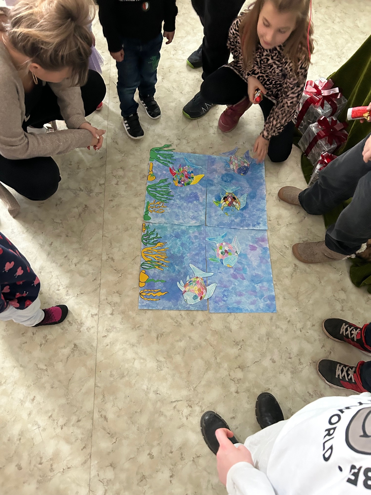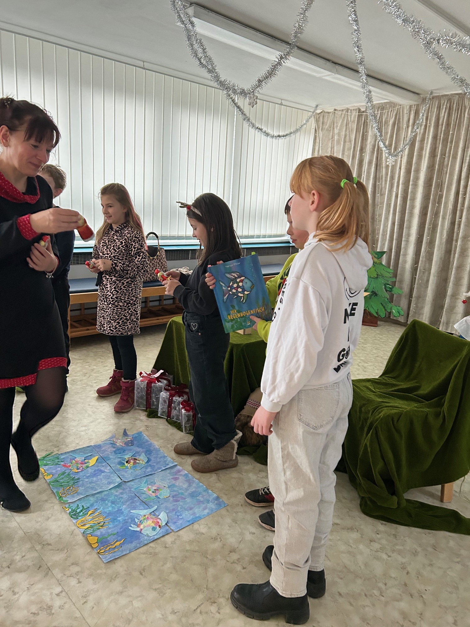 Im Rahmen unseres Leseprojekts mit einigen SchülerInnen der Klasse 3c haben wir das Buch „Der Regenbogenfisch“ gelesen und gemeinsam bearbeitet. Wir sprachen darüber, warum Teilen wichtig ist, was Freundschaft bedeutet und wie der Regenbogenfisch im Verlauf der Geschichte mutiger und freundlicher wird. Zum Abschluss unseres Projekts durften wir die Geschichte im benachbarten Integrativen-Johanniter Kindergarten vorlesen und unsere gebastelten Bilder zeigen. Durch unser Erzähltheater wurde die Geschichte noch anschaulicher. Die Kinder hörten gespannt zu und freuten sich über die funkelnden Schuppen und die Botschaft des Buches. Es war ein schönes Erlebnis, bei dem wir zeigen konnten, wie gut wir lesen können und wie viel Freude Geschichten machen. Die Kinder sind dabei über sich hinausgewachsen und haben eine Menge dazu gelernt. Wir bedanken uns an dieser Stelle nochmal herzlich für den leckeren Schoko-Weihnachtsmann.