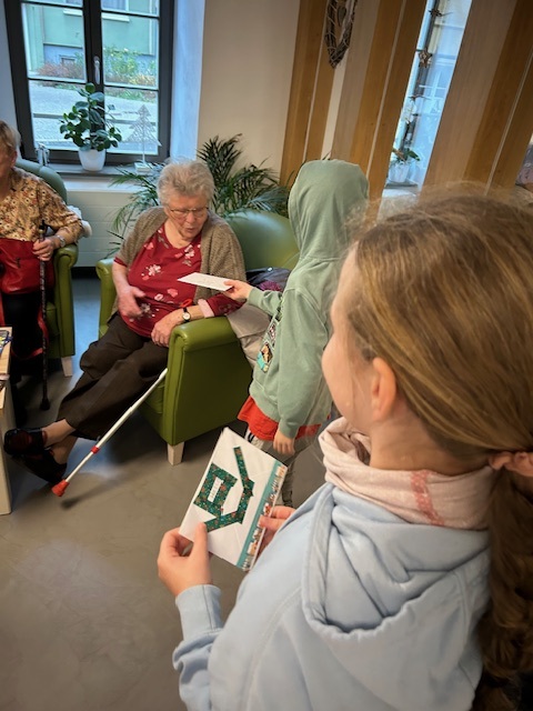 Die ersten 18 Karten wurden persönlich von der 3. Klasse in der diakonischen Seniorentagespflege im Amtshaus übergeben. Dazu wurden noch weihnachtliche Gedichte vorgetragen und gemeinsam gesungen. Auf beiden Seiten flossen ein paar Tränen.